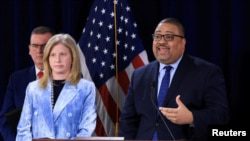 Окружной прокурор Манхэттена Элвин Брэгг и комиссар полиции Нью-Йорка Джессика Тиш выступают на пресс-конференции, на которой было объявлено, что Луиджи Манджионе предъявлено обвинение в убийстве Брайана Томпсона в Нью-Йорке, 17 декабря 2024 года.
