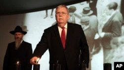 Посол Джон Теффт зажигает свечу на церемонии, посвященной Международному дню памяти жертв Холокоста, в Еврейском музее и центре толерантности в Москве, Россия, 27 января 2017 г.