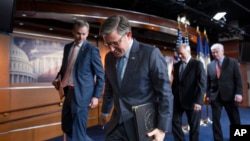 Группа законодателей-республиканцев во главе со спикером Майком Джонсоном покидают пресс-конференцию. Капитолий. 17 декабря 2024г.. (AP Photo/J. Scott Applewhite, File)