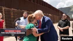 Дональд Трамп утешает Пэтти Морин, мать Рэйчел Морин, убитой нелегальным мигрантом, во время своего визита на границу с Мексикой в Херефорде, округ Кочис, штат Аризона, США, 22 августа 2024 года.