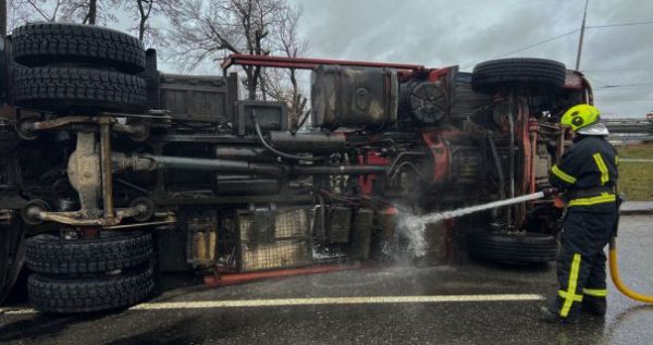 В Киеве перевернулся грузовик: двое пострадавших0
