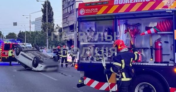 В Голосеевском районе Киева автомобиль Renault на скорости протаранил другой автомобиль, после чего опрокинулся. В полиции говорят, что водитель первого авто имел признаки наркотического опьянения