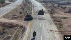 Представитель антиасадовских вооруженных формирований проезжает мимо военной техники сирийской армии, брошенной на шоссе, ведущем в Дамаск (фото Omar Haj Kadour / AFP).