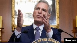 Спикер Палаты представителей Конгресса США Кевин Маккарти выступает перед журналистами в Капитолии после принятия Палатой представителей законопроекта о временном финансировании для предотвращения прекращения работы правительства