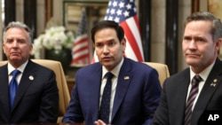 Госсекретарь Марко Рубио, советник по национальной безопасности Майк Уолтц и посланник на Ближнем Востоке Стив Уиткофф после встречи с министром иностранных дел России Сергеем Лавровым в Саудовской Аравии, 18 февраля 2025 года. (Evelyn Hockstein/Pool Photo via AP)