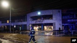 Спасатель пересекает затопленную улицу после российского ракетного удара по Киеву, Украина, в субботу, 1 января. 18 октября 2024 г. (AP Photo/Евгений Малолетка)