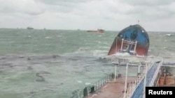 Вид с борта танкера «Волгонефть 239» на тонущую часть судна. Social Media/via REUTERS.