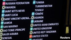 Результаты голосования на Генеральной Ассамблее ООН по проекту резолюции с осуждением российской агрессии в Украине. На экране видно, что США, как и Россия проголосовали против данного документа. 24 февраля 2025 года. Reuters.