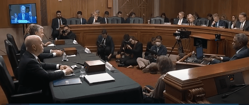 Министр внутренней безопасности США Алехандро Майоркас дает показания рядом с директором ФБР Кристофером Рэем и директором Национального контртеррористического центра Кристином Абизаидом во время слушаний в Сенате по вопросам внутренней безопасности и правительственным делам, посвященных угрозам для США, на Капитолийском холме в Вашингтоне, США, 31 октября 2023 года. (Youtube/скриншот)