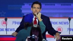 Губернатору Флориды Рону Десантису обновляют телевизионный грим во время рекламной паузы на первых дебатах кандидатов от Республиканской партии в рамках президентской кампании в США 2024 года. Милуоки, штат Висконсин.