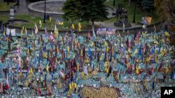 До российского вторжения это была обычная лужайка в самом центре Киева. Туристы приезжали сюда фотографироваться, а местные жители гуляли здесь по выходным.