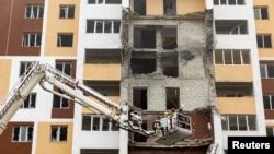 Спасатели работают на месте удара беспилотника, в городе Вишневое Киевской области, Украина, 25 января 2025 года