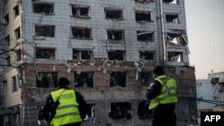 Сотрудники полиции осматривают поврежденное здание после ракетного обстрела в Киеве 12 февраля 2025 года