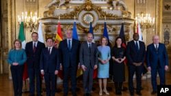 Министры иностранных дел ведущих европейских стран на фото во время встречи по вопросам европейской обороны и Украины. Париж. 12 февраля 2025 г. (Кристоф Пети-Тессон, Pool Photo через AP).